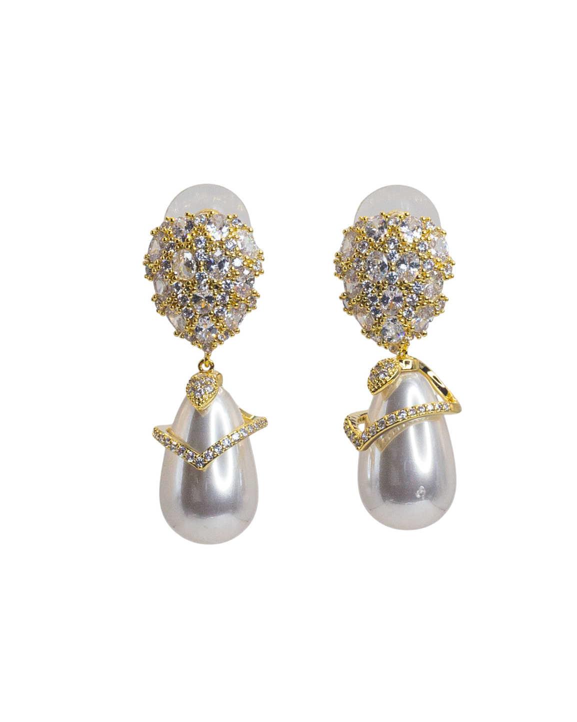 These stunning earrings feature a beautiful pearl drop, adorned with sparkling diamonds and a golden band. The intricate design of the diamonds around the pearl adds a touch of sophistication, making them perfect for formal occasions and evening wear.