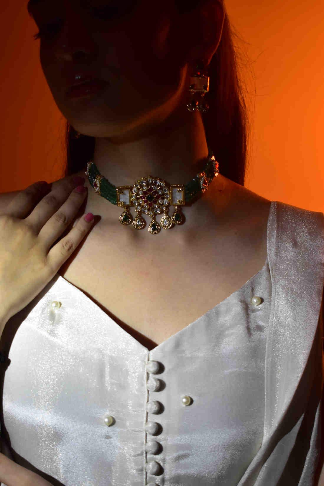 Adorn yourself with the elegance of royalty. The Emerald Grace Kundan Choker Set combines the charm of traditional craftsmanship with modern grace — perfect for brides and queens at heart.”