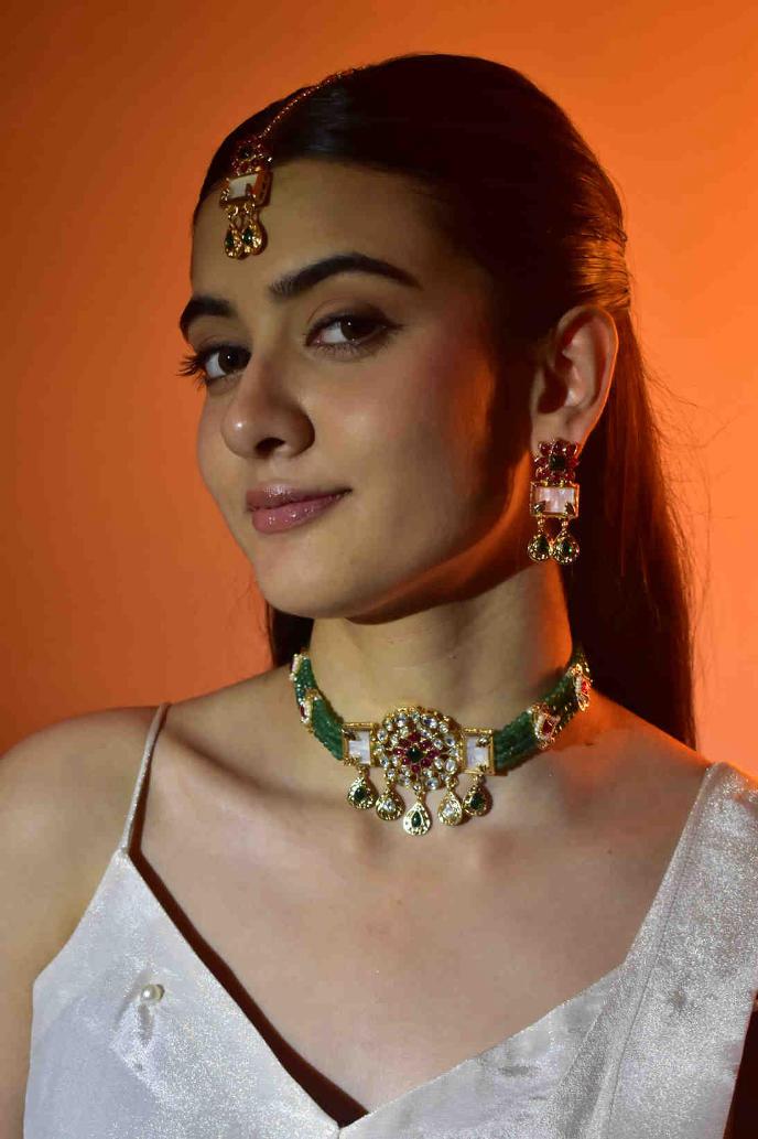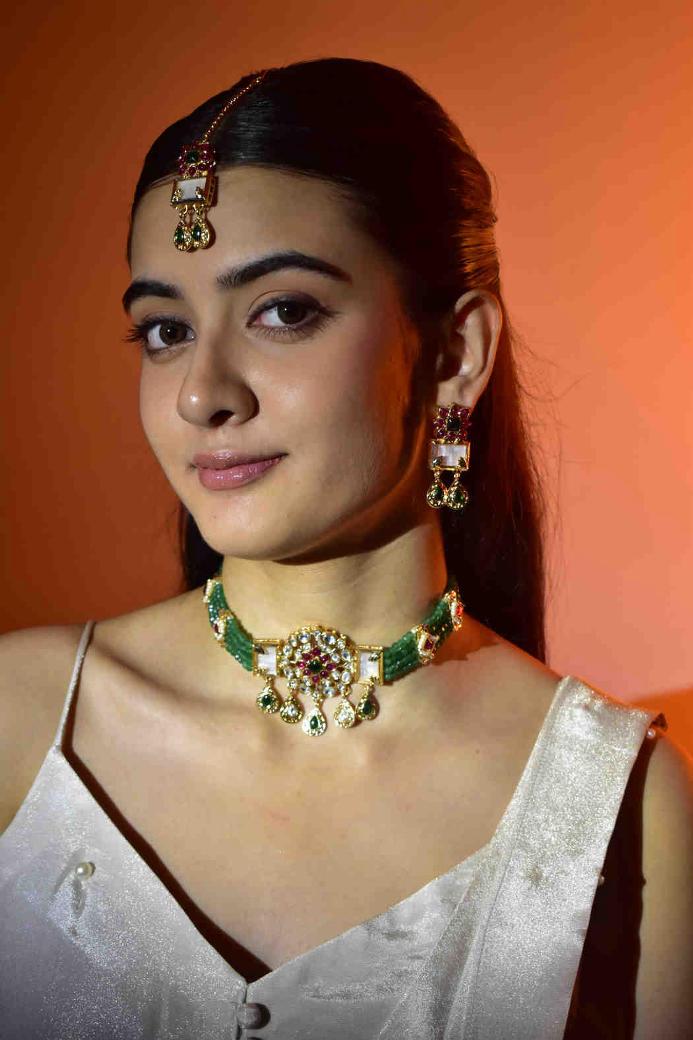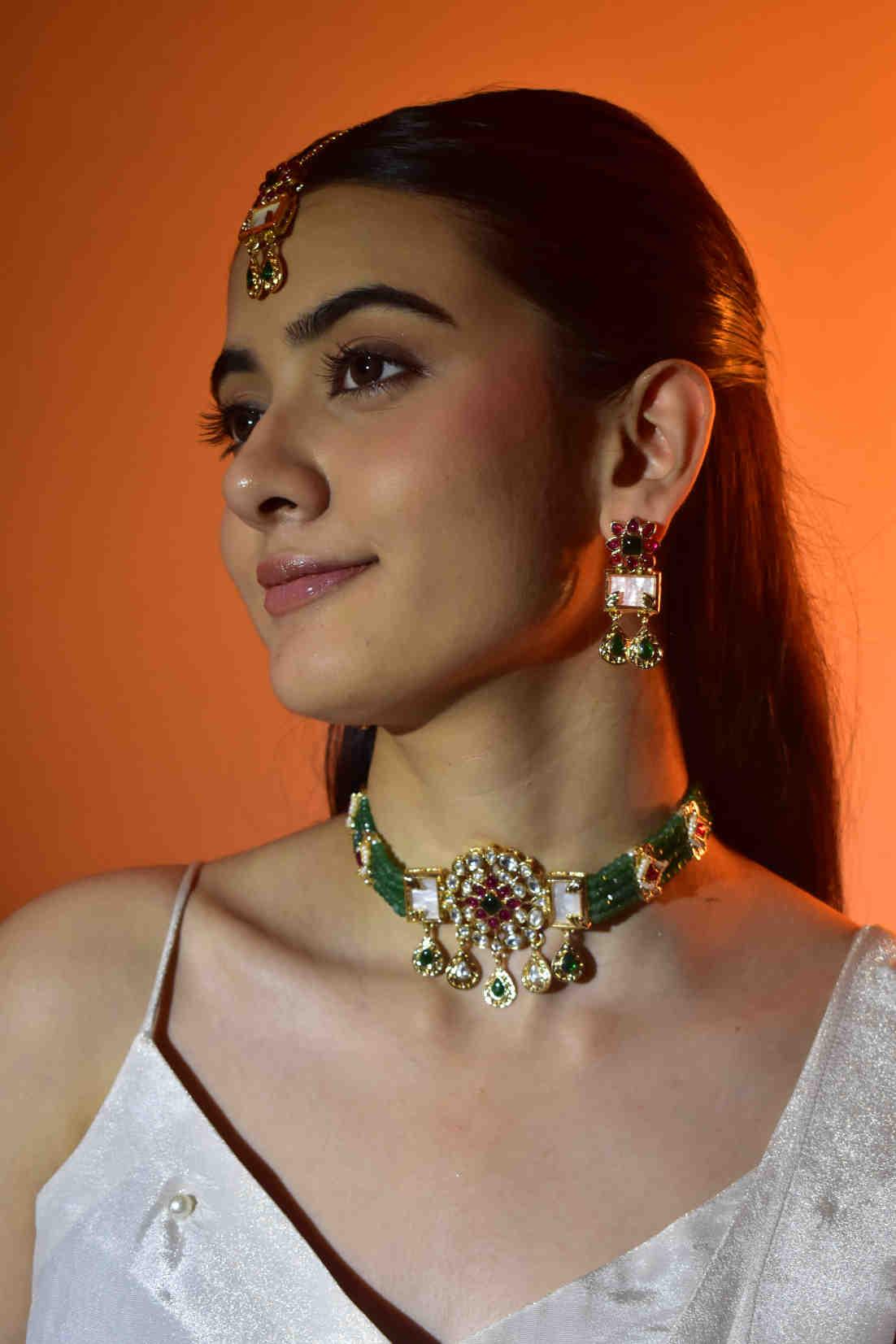 Radiate royal elegance with this exquisite Emerald Grace Kundan Choker Set, a masterpiece that blends traditional artistry with modern sophistication. Handcrafted with intricate Kundan stones, emerald green beads, and ruby accents, this choker is paired with matching earrings and a maang tikka for a complete regal look. The design reflects timeless Mughal inspiration, perfect for weddings, festive occasions, or royal gatherings.