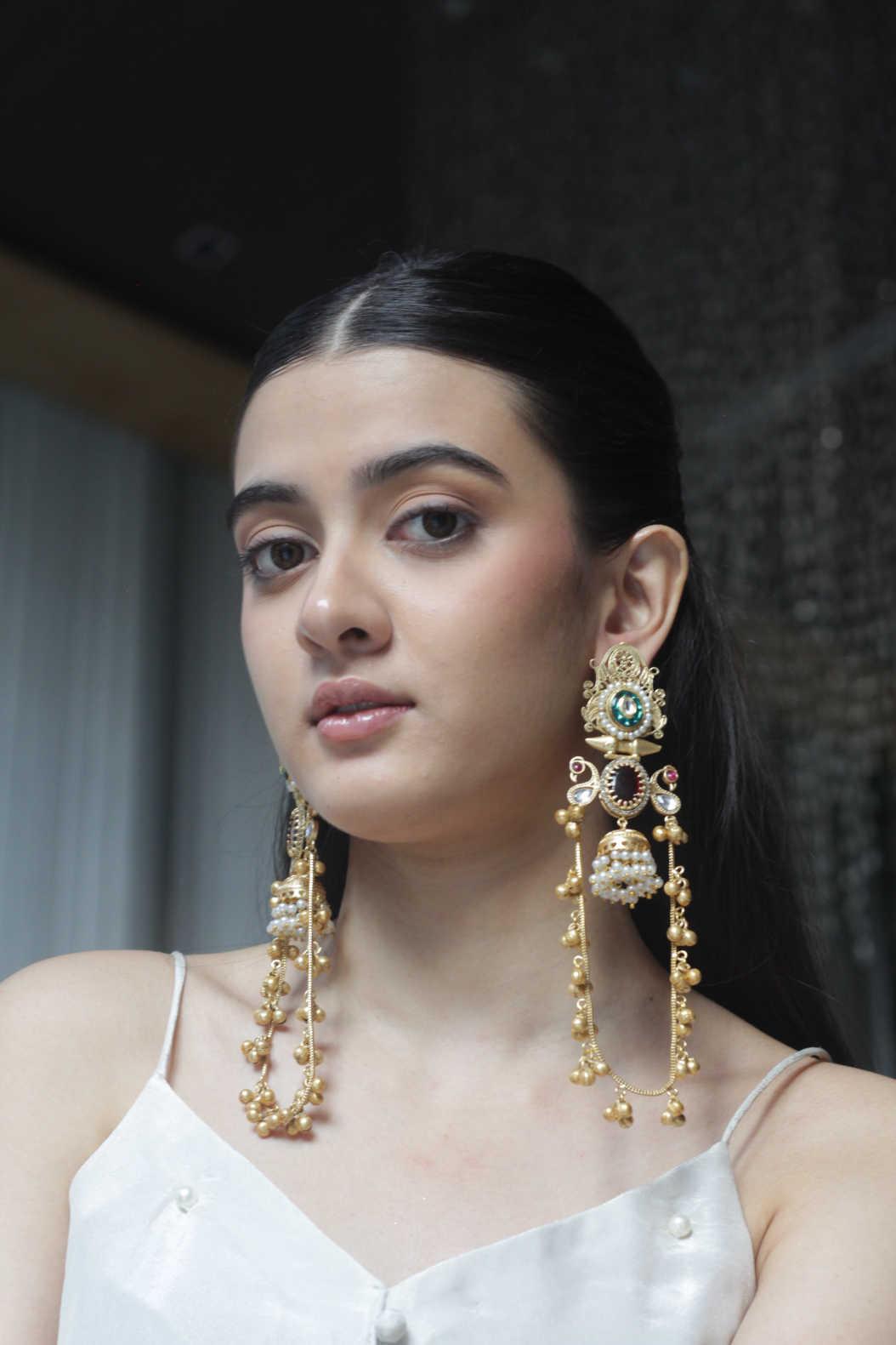 EarringsThese exquisite earrings feature a regal blend of traditional craftsmanship and intricate detailing. Designed in antique gold tone, they showcase vibrant red and green stones with delicate pearl accents.