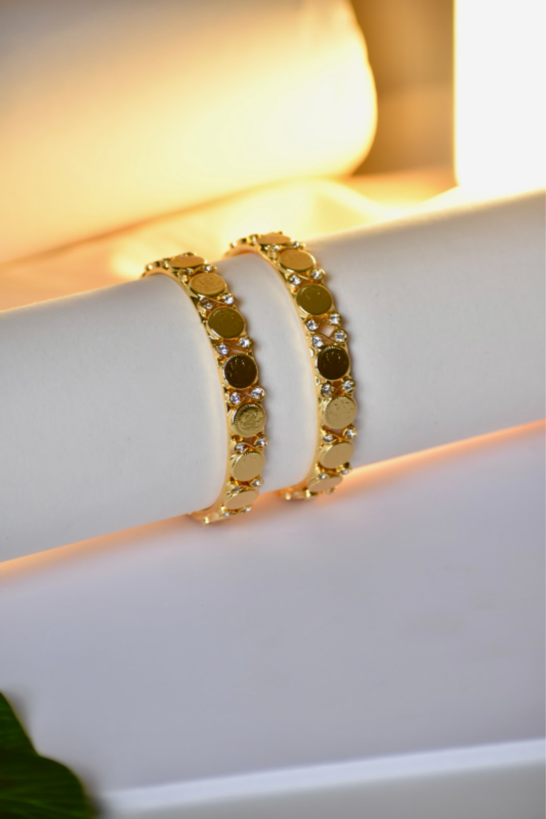 BanglesThese elegant gold-plated bangles feature alternating polished discs and sparkling stones, creating a modern yet traditional look. Perfect for festive occasions or daily wear, they add a touch of sophistication and timeless beauty to any ensemble.