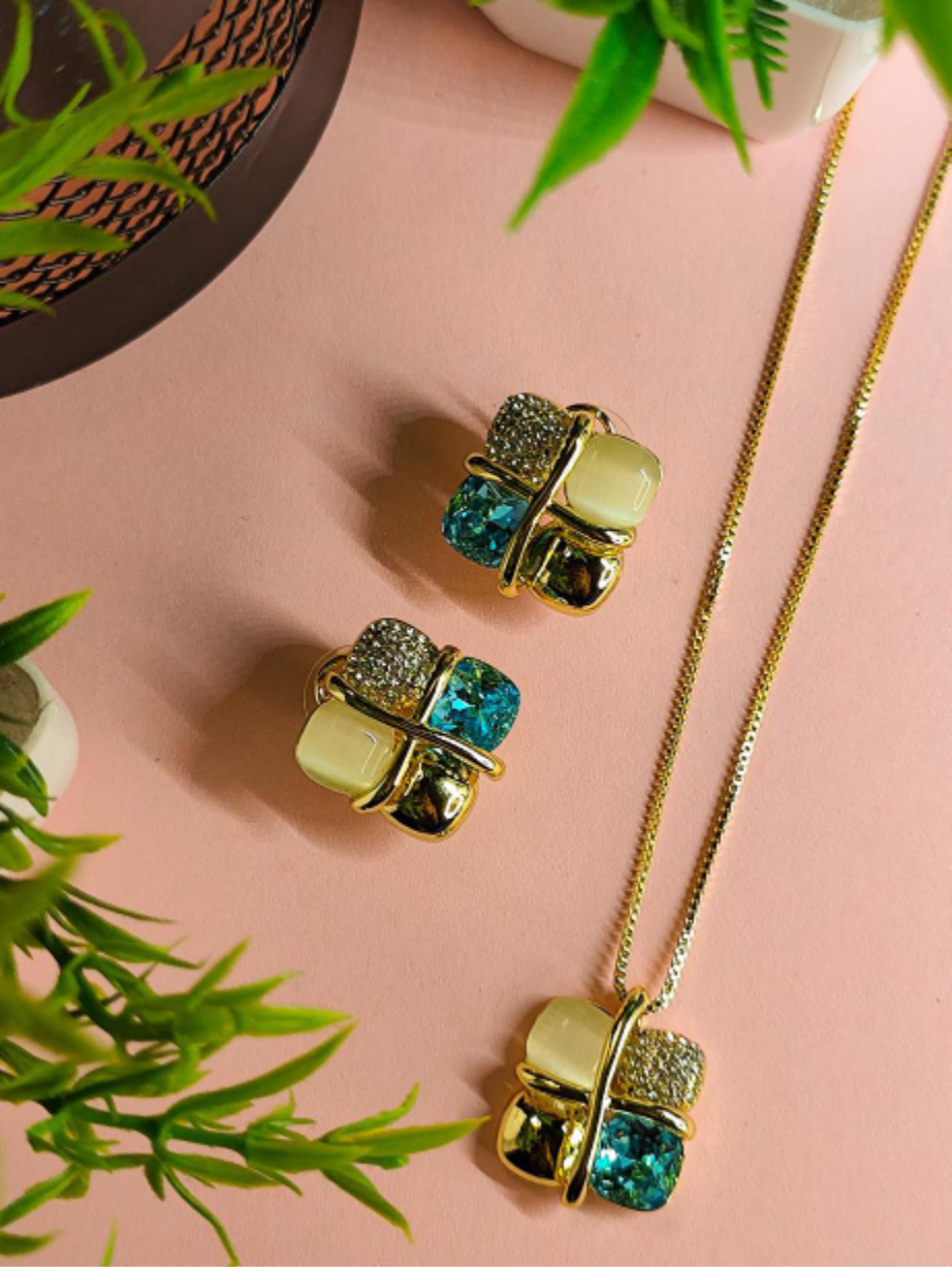 Understated yet alluring, this gold-plated set features deep midnight-blue crystals encased in soft, rounded frames. The sleek, structured design offers a contemporary touch to a classic silhouette — making it the perfect choice for effortless luxury.