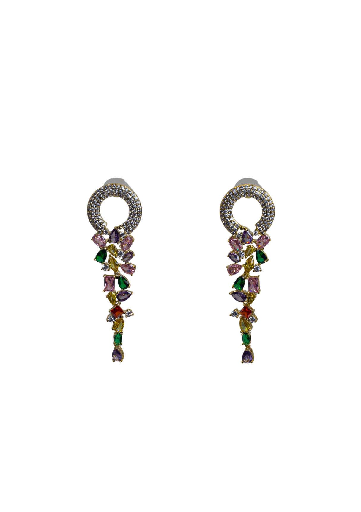 EarringsThese eye-catching earrings feature a beautiful cascade of multi-colored crystals, including shades of purple, green, yellow, and red, all framed by pave diamonds. The elegant hoop design at the top enhances the colorful crystals, creating a dynamic and sophisticated look. Perfect for special occasions, evening events, or adding a vibrant touch to your daily wear, these earrings are sure to draw attention with their bold and glamorous appeal. The combination of colorful gemstones and sparkling diamonds makes them a versatile addition to any jewelry collection.