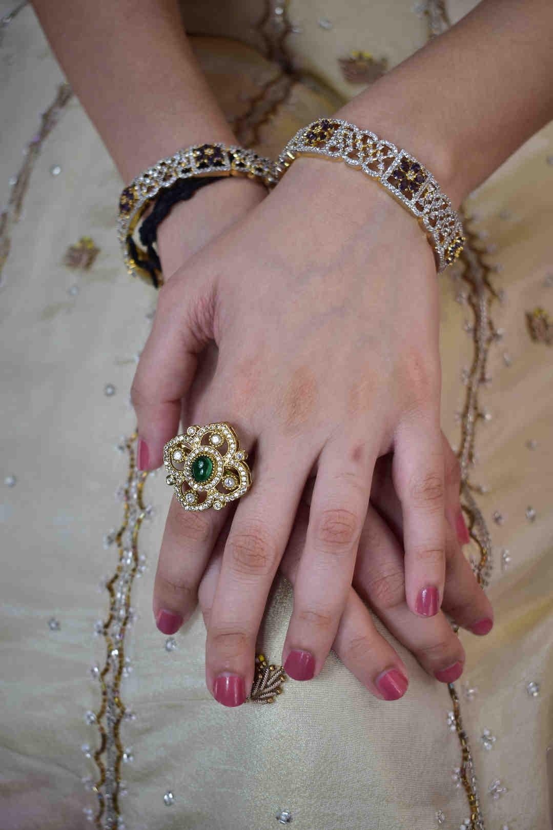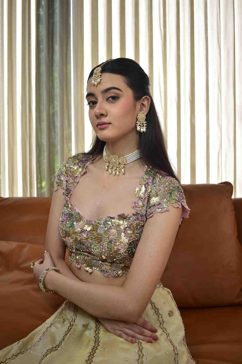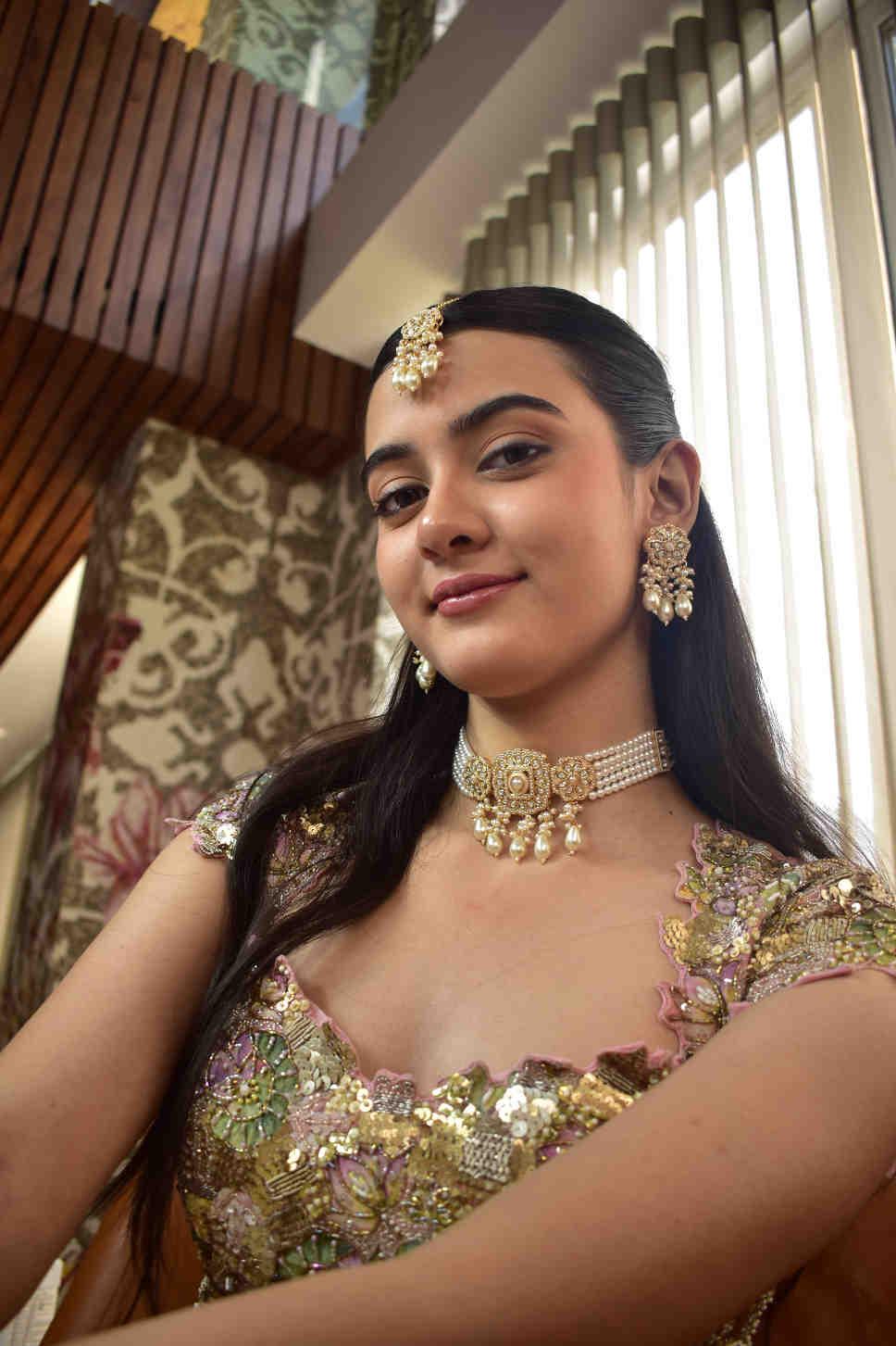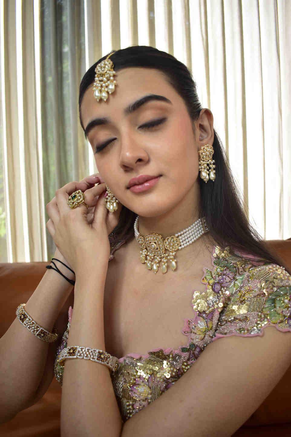 This exquisite Pastel Radiance Bridal Set captures timeless elegance with its delicate blend of gold, pearls, and shimmering stones. The ensemble includes a statement choker necklace adorned with floral motifs, matching chandelier earrings, a maang tikka, intricately crafted bangles, and a bold floral ring. The jewelry complements soft pastel lehengas beautifully, adding an ethereal glow perfect for engagement, sangeet, or bridal portraits.