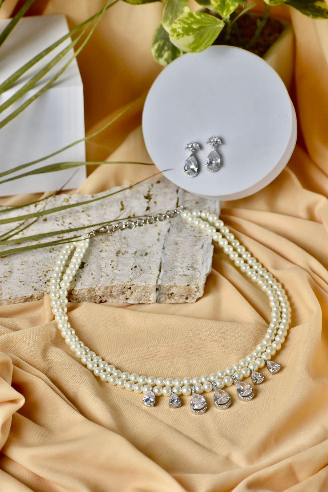 The centerpiece is a double-strand pearl necklace adorned with sparkling teardrop-shaped crystal pendants, giving it a luxurious and timeless appeal. Positioned above the necklace, on a round white display stand, is a pair of matching crystal drop earrings with a teardrop design, perfectly complementing the necklace.