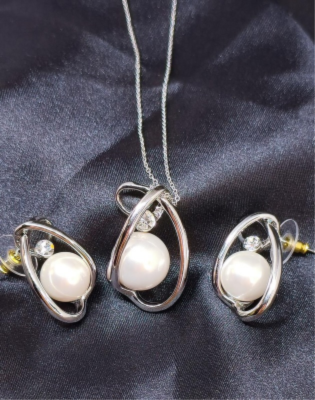 Modern minimalism meets timeless charm in this silver-toned pendant and earring set. Lustrous pearls sit gracefully within fluid metallic loops, accented by a single crystal sparkle. A perfect blend of sophistication and simplicity — ideal for both everyday elegance and evening refinement.