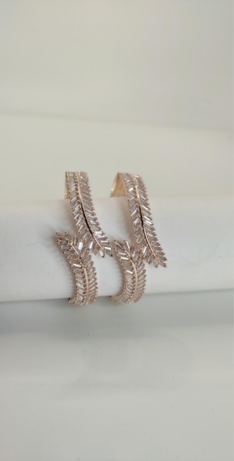 BanglesThese stunning rose-gold bangles feature a graceful feather-inspired design, crafted with shimmering baguette-cut CZ stones arranged in a flowing pattern. The sleek rose-gold finish adds a touch of luxury, while the intricate detailing gives them a soft, feminine, and premium look. Perfect for weddings, parties, and modern festive styling—these bangles elevate any outfit with effortless elegance.