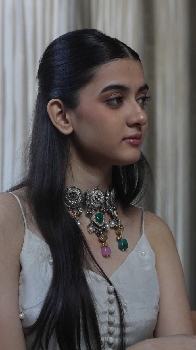 An exquisite necklace adorned with vibrant multicolored gemstones and intricate detailing, paired with matching earrings. This regal jewelry piece adds a statement of luxury and grace, perfect for special occasions and elegant ensembles.