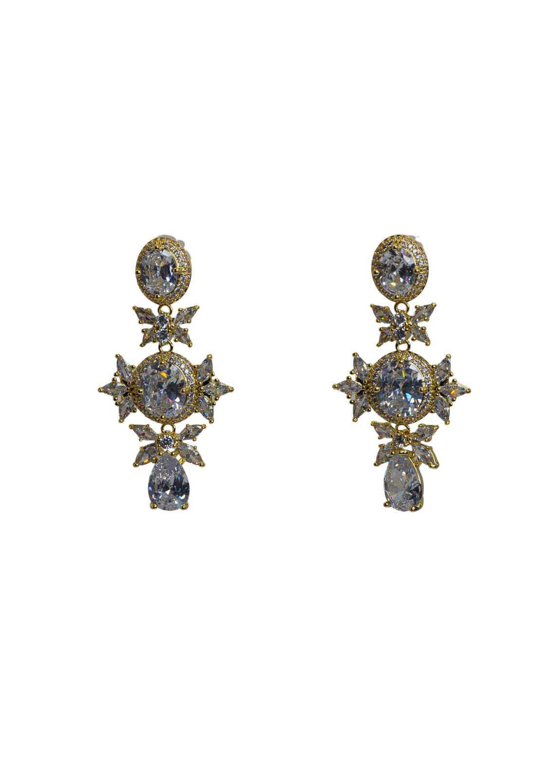 These exquisite earrings feature a delicate floral design adorned with sparkling diamonds set in a luxurious gold setting. The design is highlighted by a combination of round and pear-shaped stones, creating a graceful and sophisticated look perfect for any special occasion.