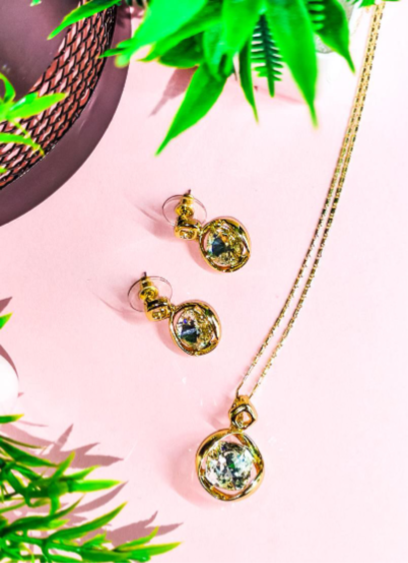 Bathed in the hues of sunshine, this pendant and earring set radiates warmth and optimism. Golden crystals framed in gold metal create a luminous finish that brightens any outfit. A beautiful piece for those who love subtle glamour with a golden glow.