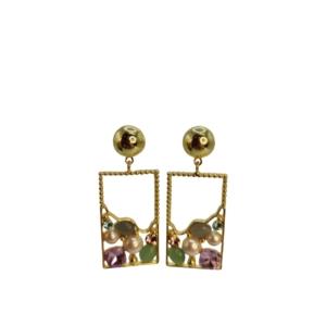 EarringsAn artistic play of geometry and grace — these rectangular gold earrings feature delicate clusters of aqua stones, lavender crystals, and pearls. The open-frame design adds a modern touch, while the blend of soft pastels creates a serene, ocean-inspired charm. Perfect for those who love structure with subtle sparkle.