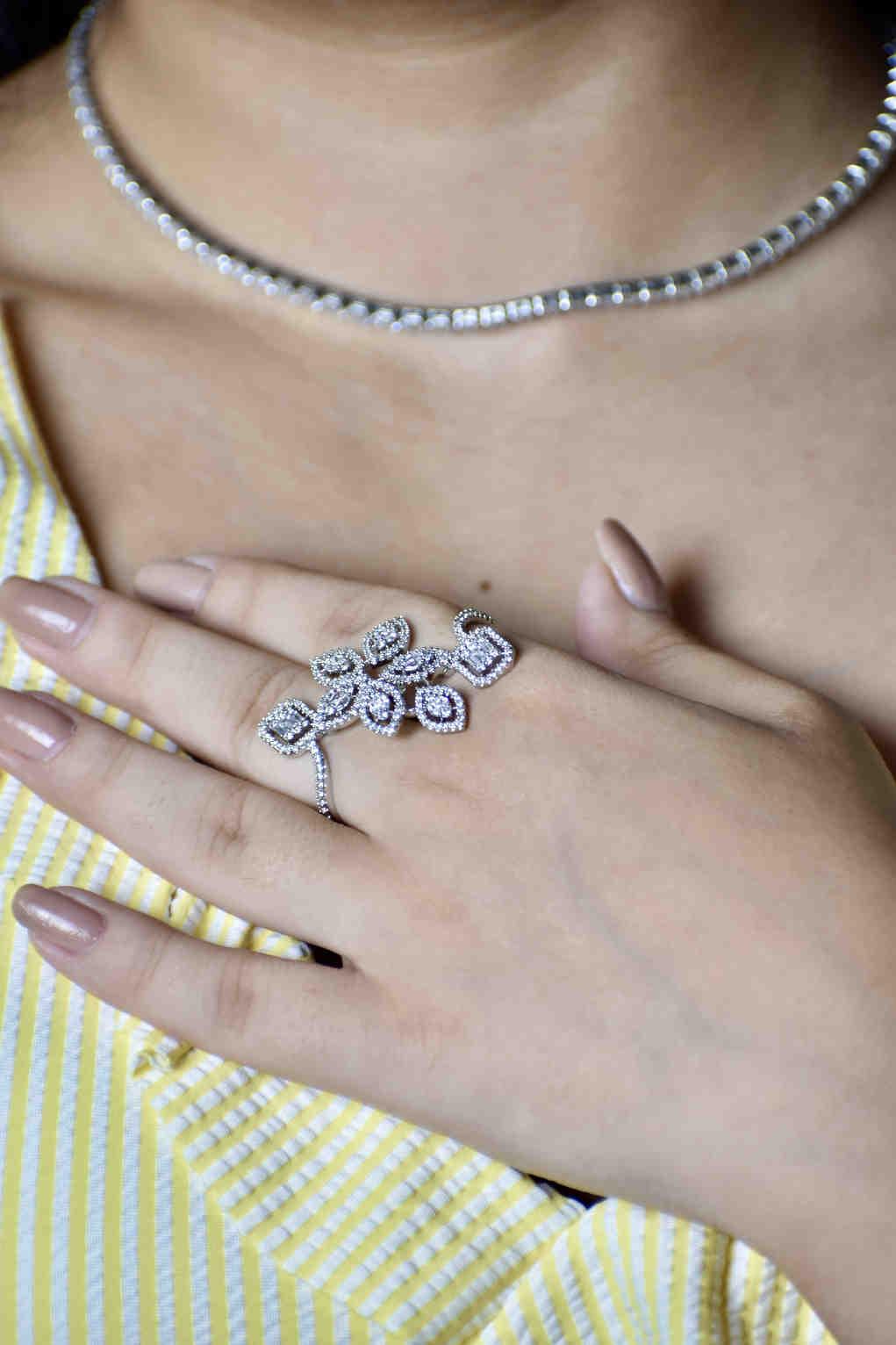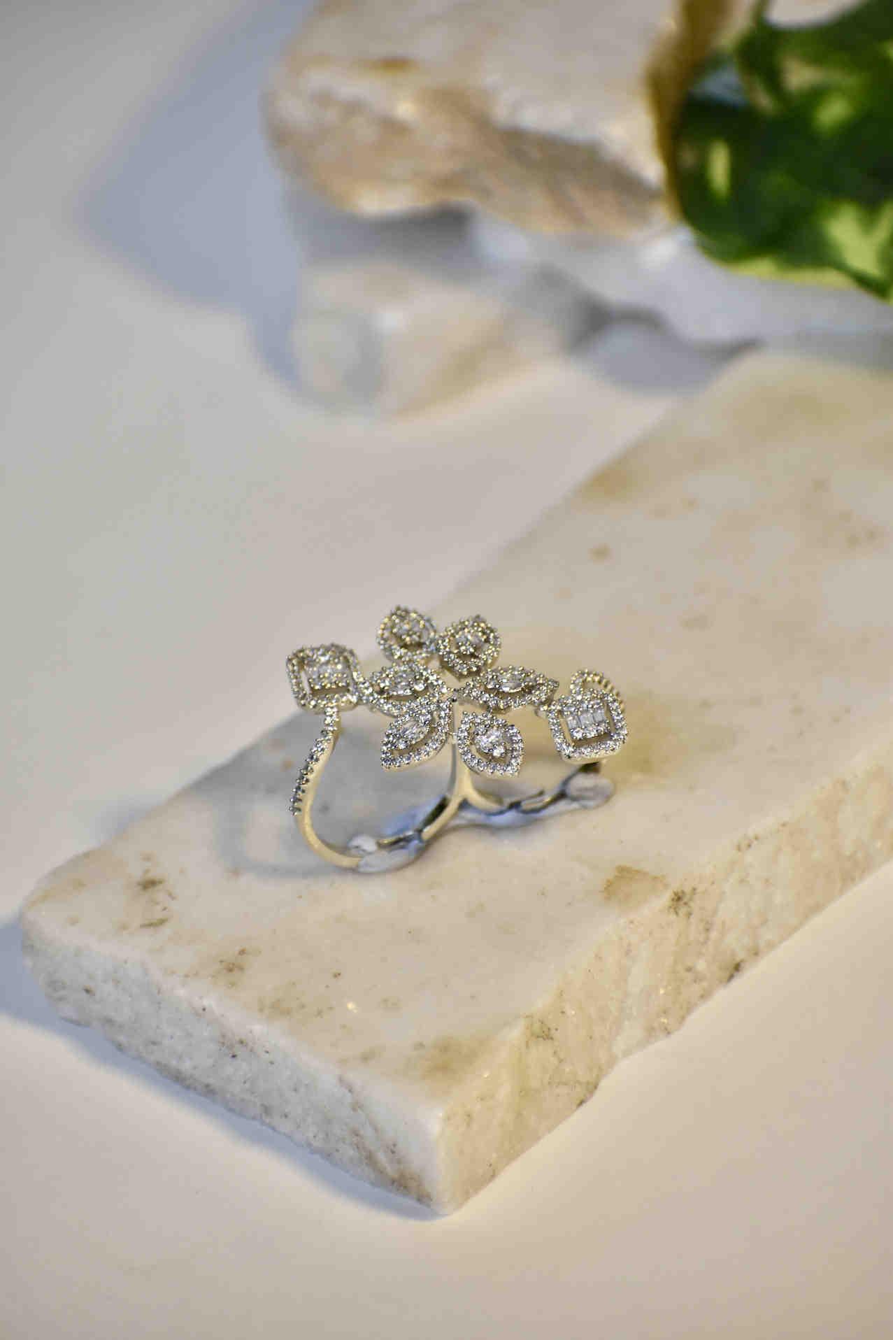 RingsThis stunning ring features a cluster of sparkling diamonds arranged in the shape of a delicate flower. The intricate design showcases a mix of round and square-cut diamonds, creating a beautiful contrast. Crafted in a sophisticated band, this piece exudes elegance and grace, making it the perfect accessory for both special occasions and everyday luxury.