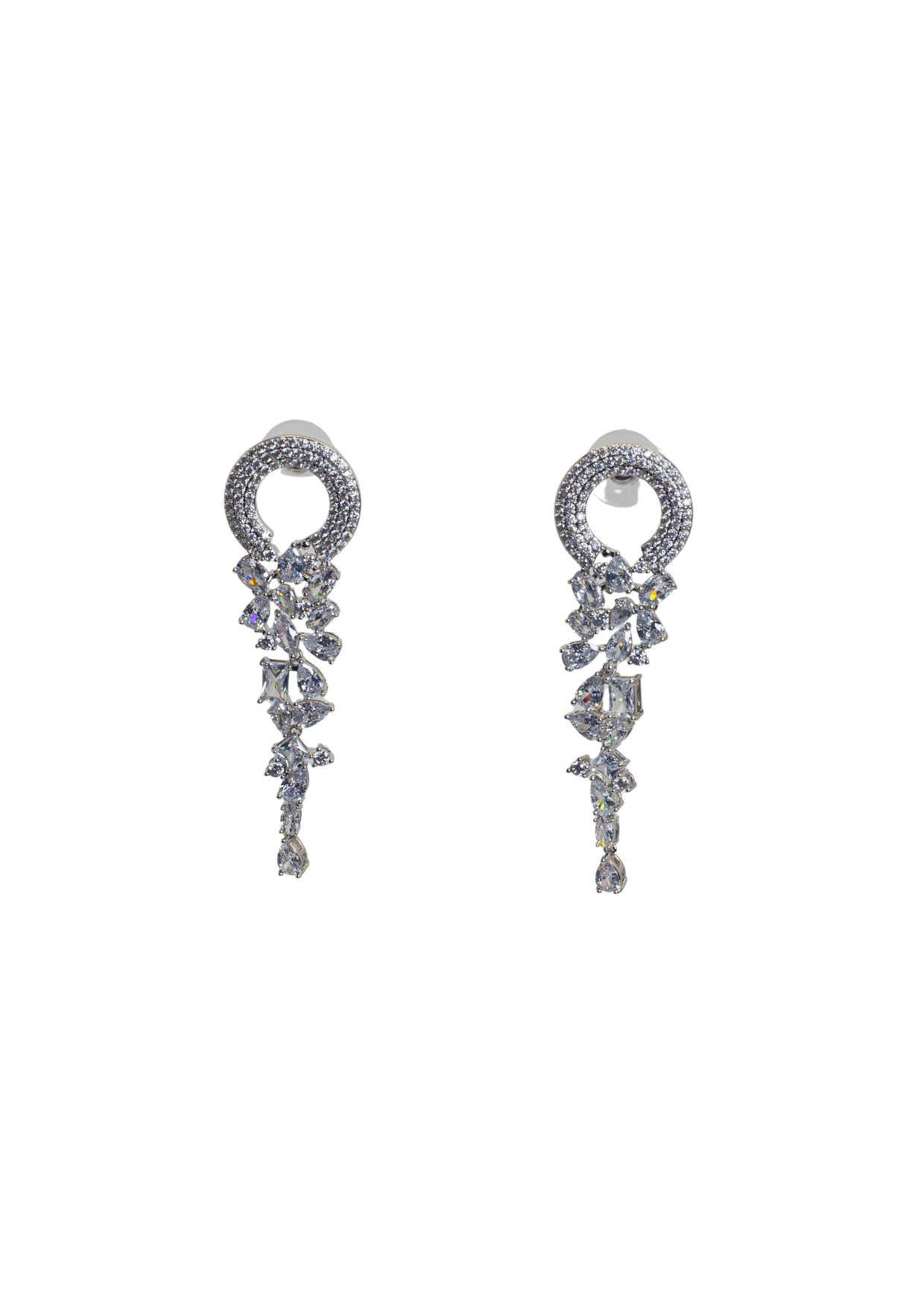EarringsThese elegant earrings combine a sleek circular pave diamond detail with a beautiful cascade of sparkling crystals. Each crystal is precisely cut to enhance its brilliance, creating a captivating shimmer as it moves. The high-quality design and luxurious look make these earrings a perfect addition to any formal event or evening celebration, adding a touch of glamour and refinement to any outfit.