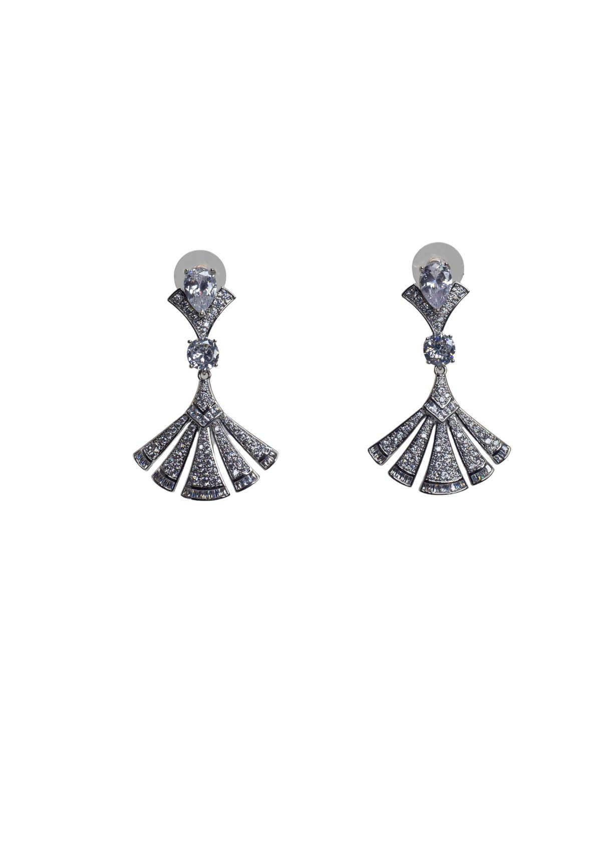 These dazzling earrings feature a fan-shaped design adorned with sparkling diamonds. The elegant pattern, highlighted by teardrop-shaped crystals at the top, adds a sophisticated touch to any ensemble. Perfect for formal occasions, these earrings will provide a refined and luxurious look.