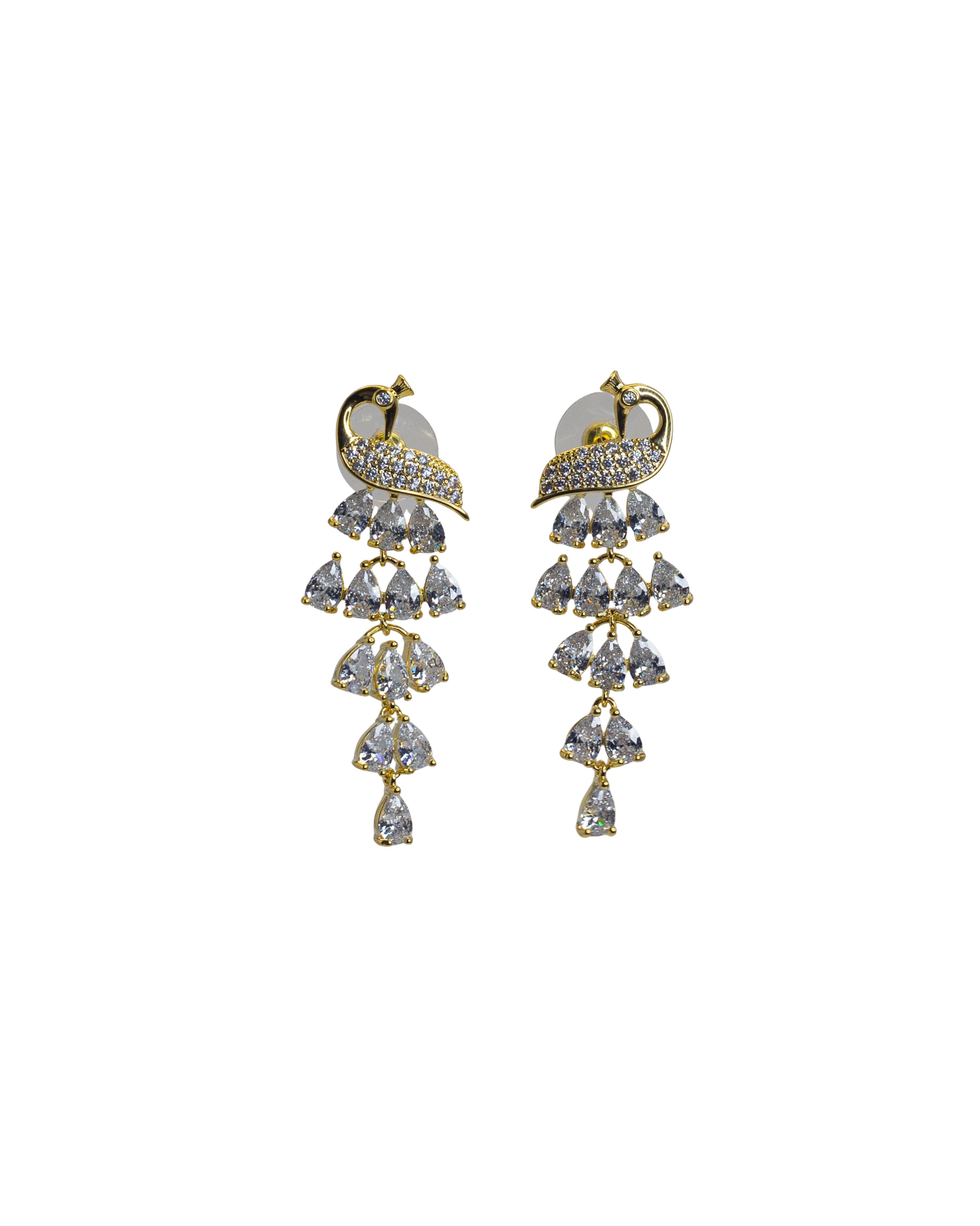 This exquisite pair of earrings features a unique peacock-inspired design, with sparkling teardrop-shaped diamonds cascading gracefully in a tiered pattern. The intricate detailing and high-quality gold finish make these earrings a perfect addition to any jewelry collection. The perfect accessory for elegant evening events or to add a touch of glamour to your daily style.