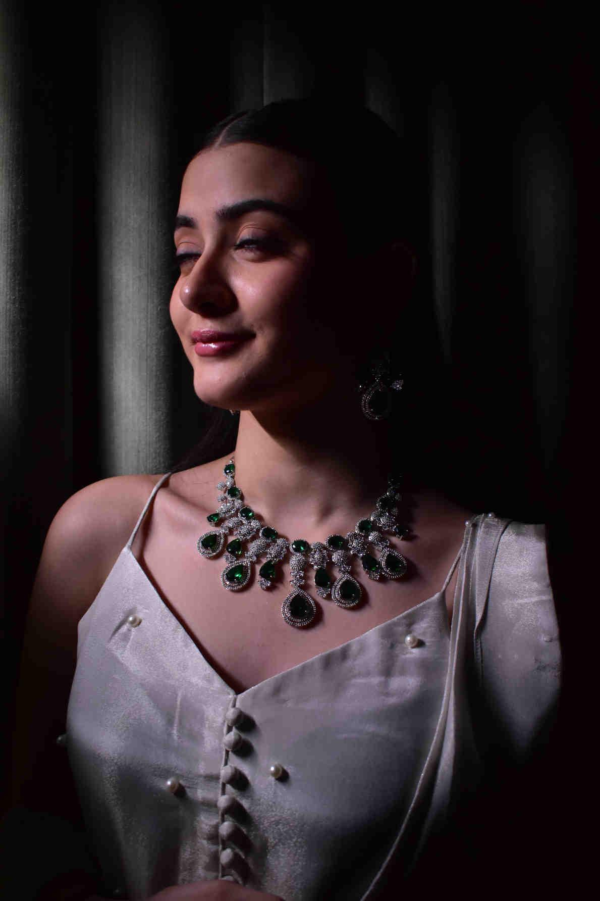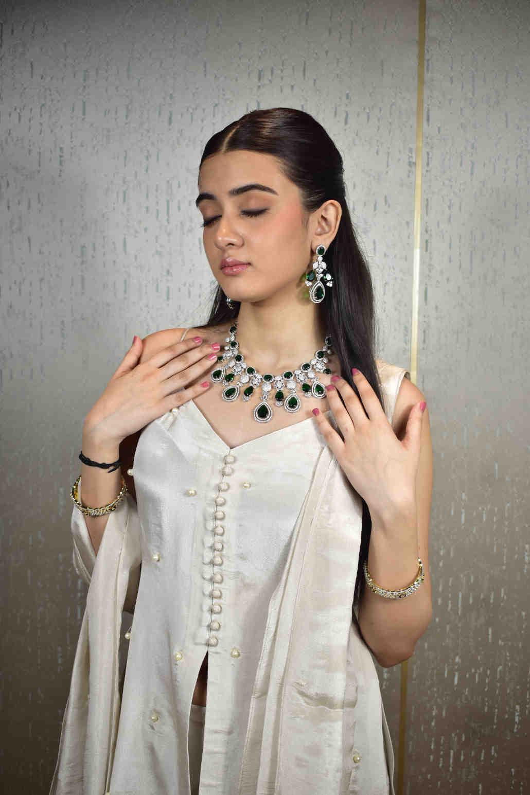 A luxurious necklace and earring set featuring teardrop-shaped emerald-green stones bordered with sparkling white crystals. The cascading design radiates opulence and sophistication, making it a perfect statement piece for grand occasions.