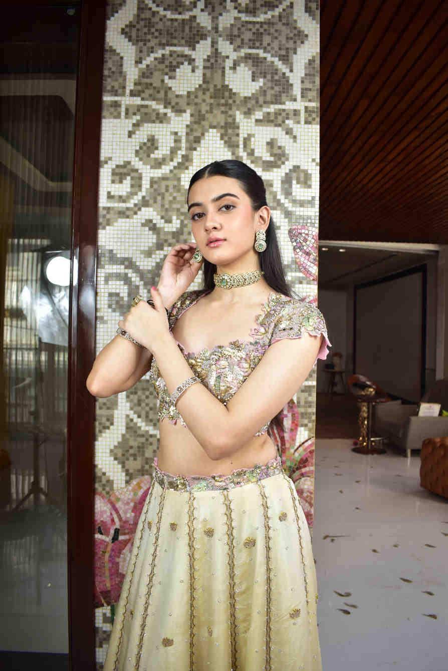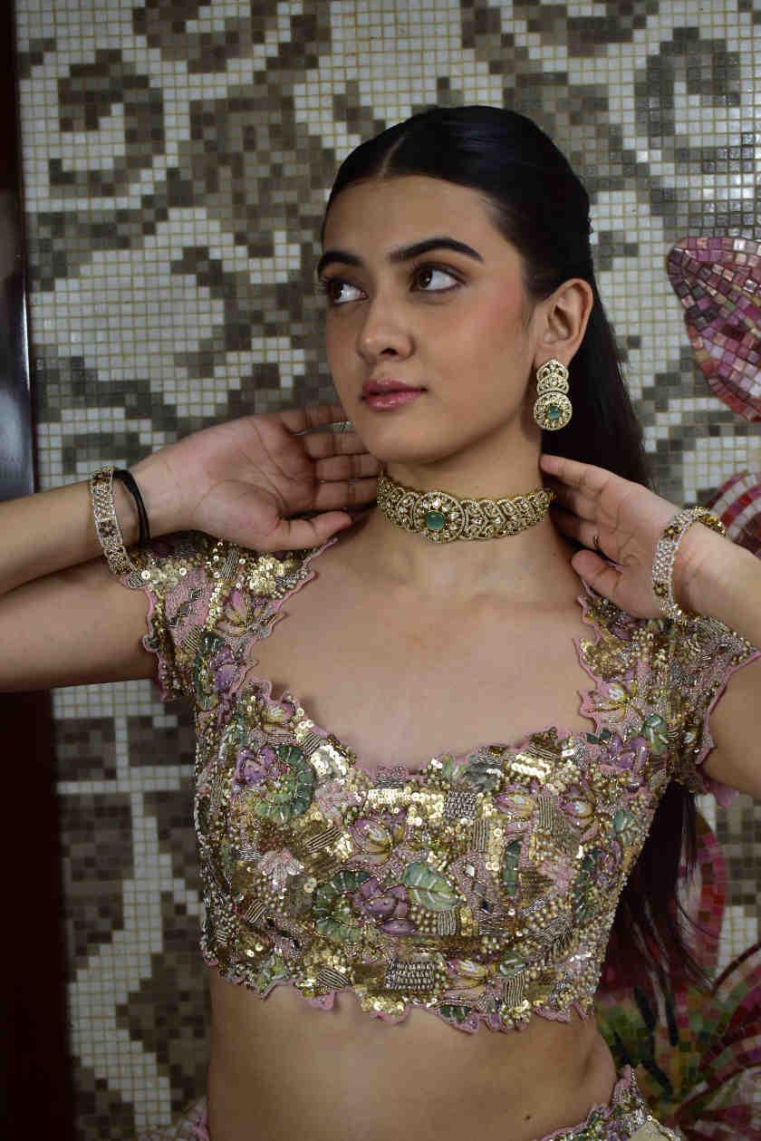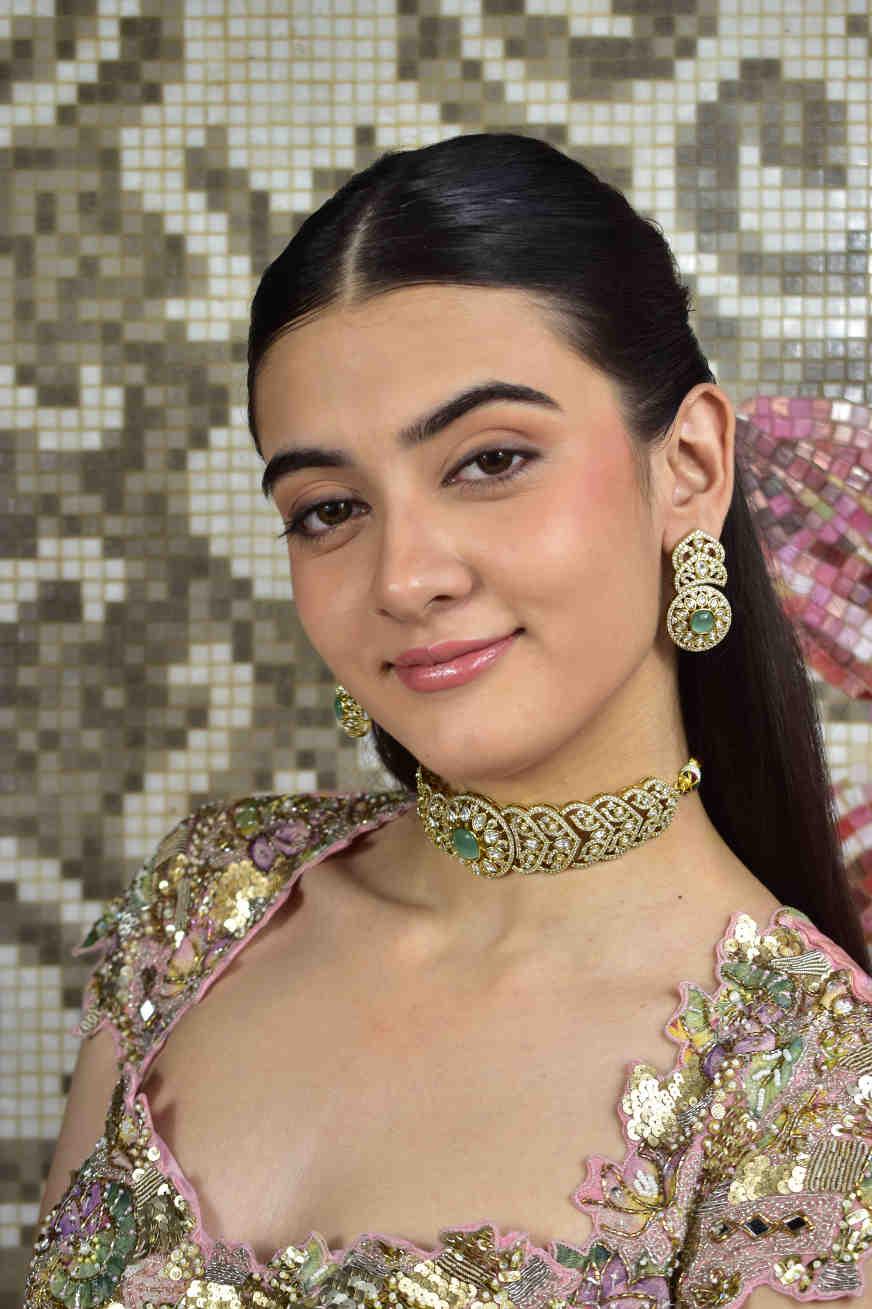 This handcrafted Kundan choker set embodies timeless Indian artistry and grace. The choker features intricate gold detailing with a striking emerald-green stone centerpiece, paired with matching statement earrings and a delicately designed bracelet. Perfect for weddings, festive occasions, or elegant evening events, this set enhances any outfit with regal charm and sophistication.