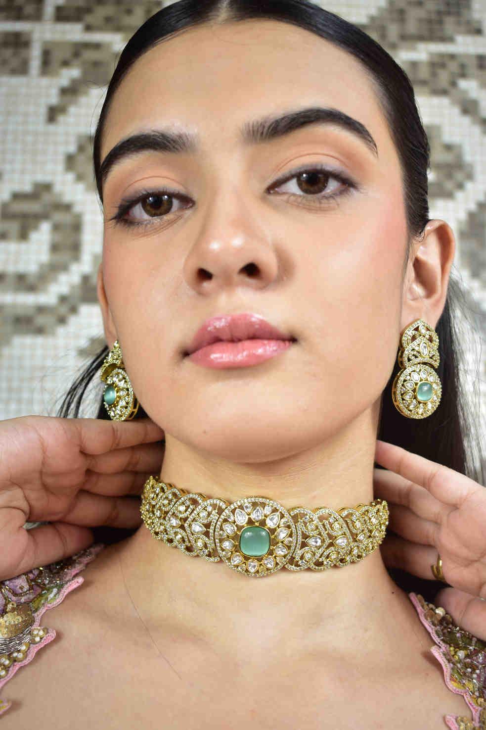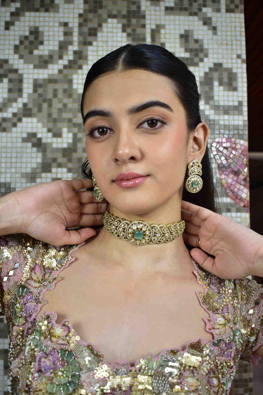 This stunning jewelry ensemble includes a bold choker necklace, statement earrings, and a matching bracelet — all intricately adorned with fine Kundan work and a central emerald-green gemstone that exudes royal grace.