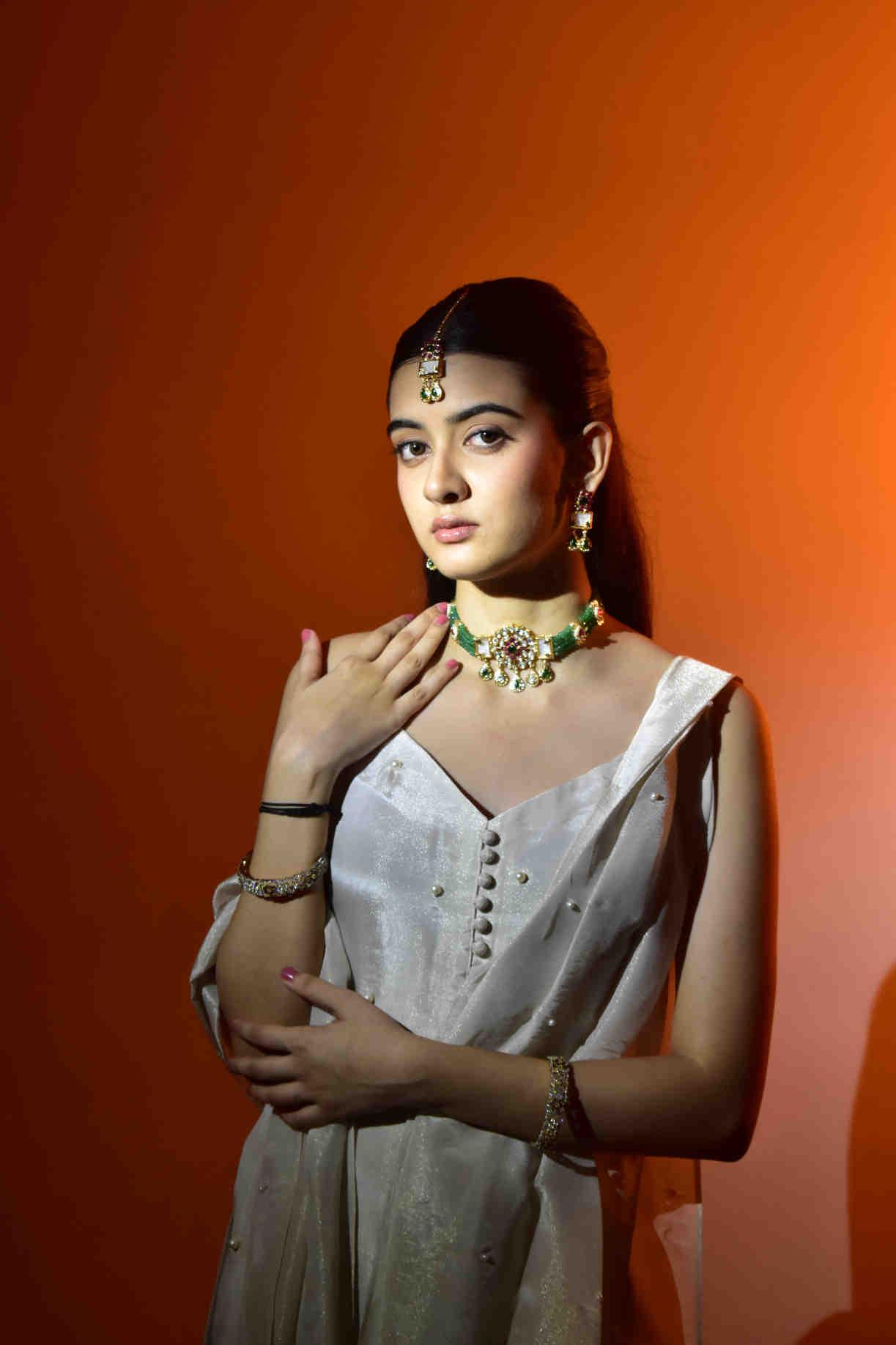 Adorn yourself with the elegance of royalty. The Emerald Grace Kundan Choker Set combines the charm of traditional craftsmanship with modern grace — perfect for brides and queens at heart.”