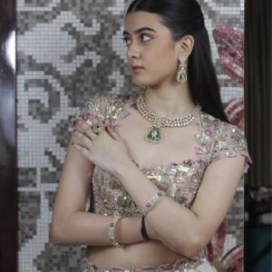 An exquisite Polki necklace set featuring a central emerald-green pendant surrounded by uncut stones and pearls. Paired with matching earrings and a statement ring, this elegant set radiates royal sophistication—perfect for weddings and festive occasions.