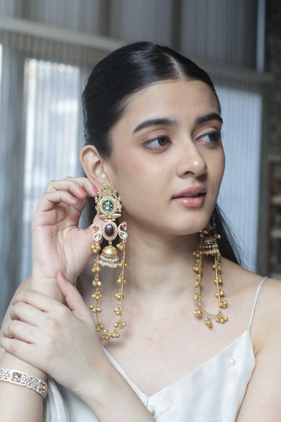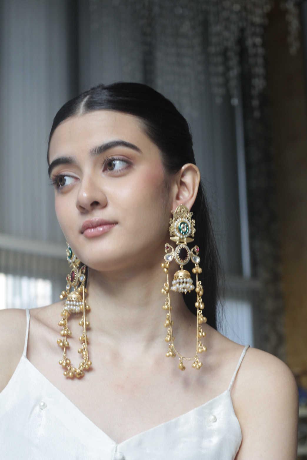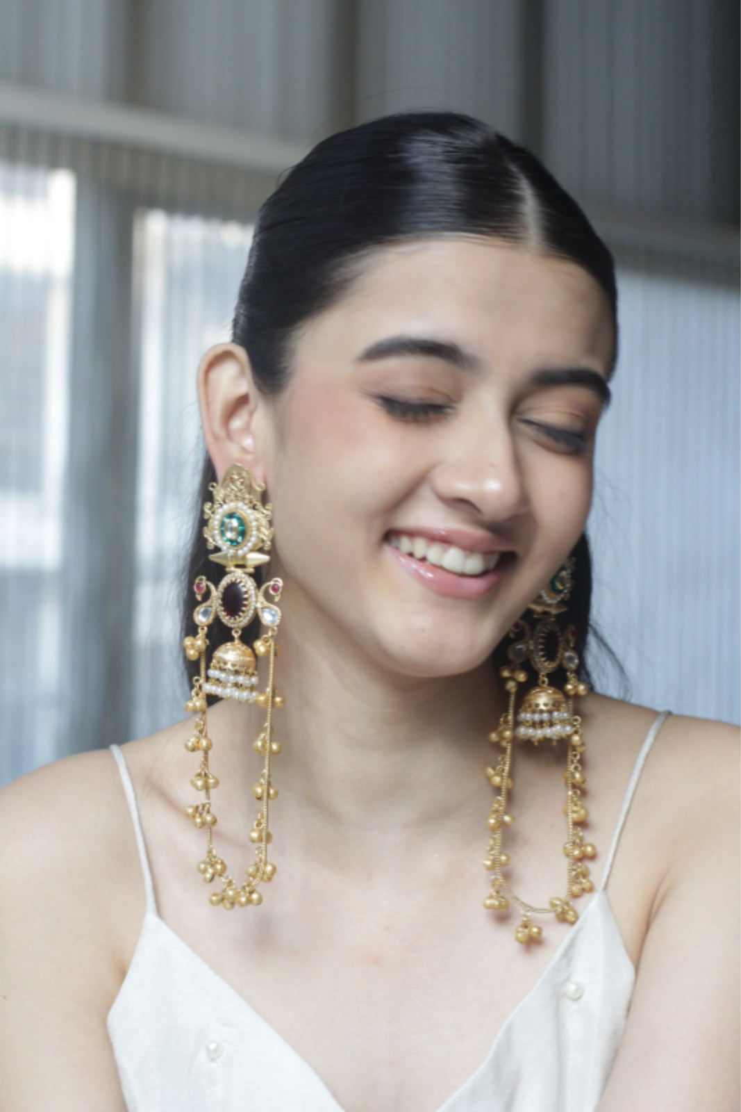 EarringsThese exquisite earrings feature a regal blend of traditional craftsmanship and intricate detailing. Designed in antique gold tone, they showcase vibrant red and green stones with delicate pearl accents.
