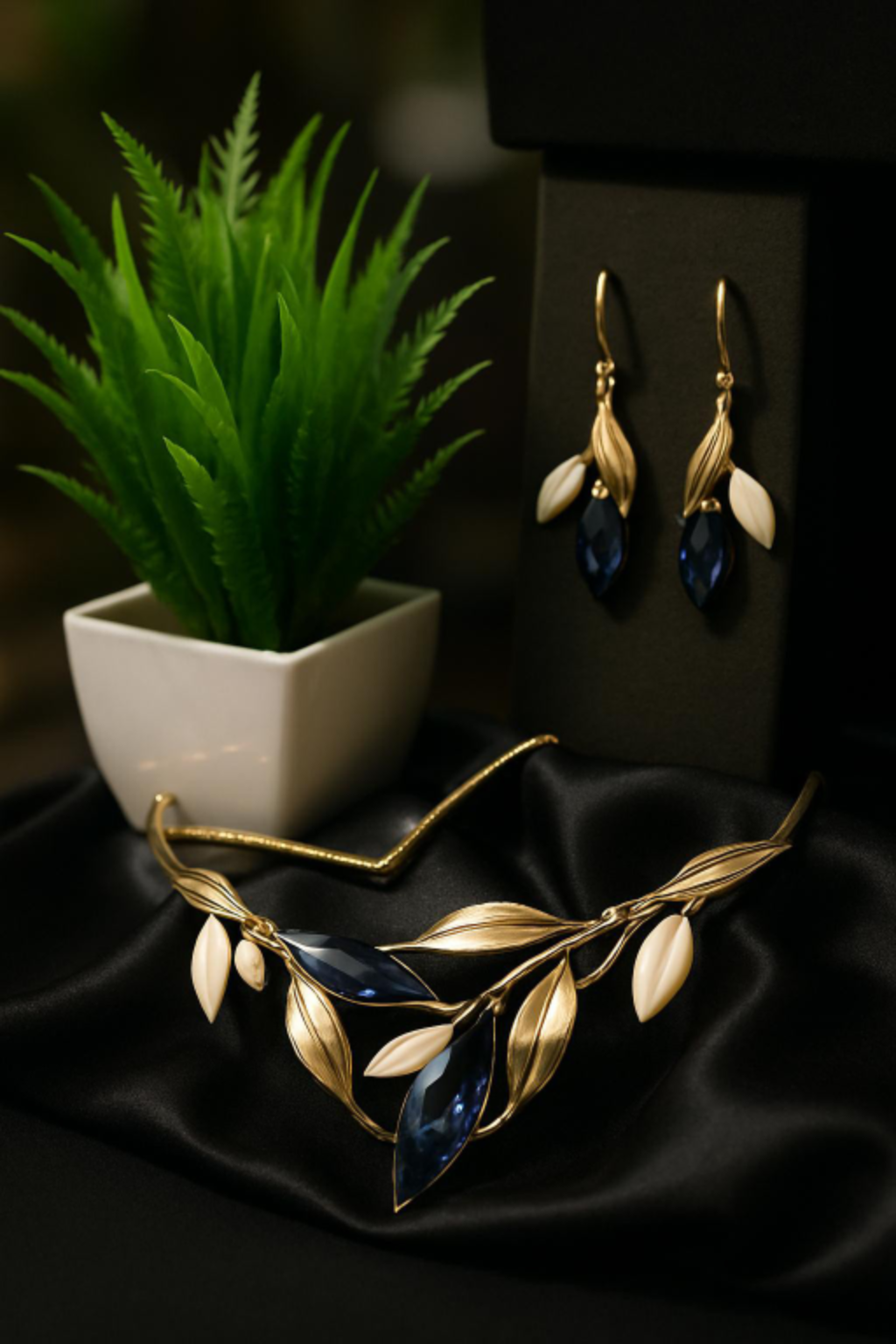 Gold branches entwine with deep navy and ivory stones — a stunning combination that exudes mystique and grace. A poetic statement for evening soirées.