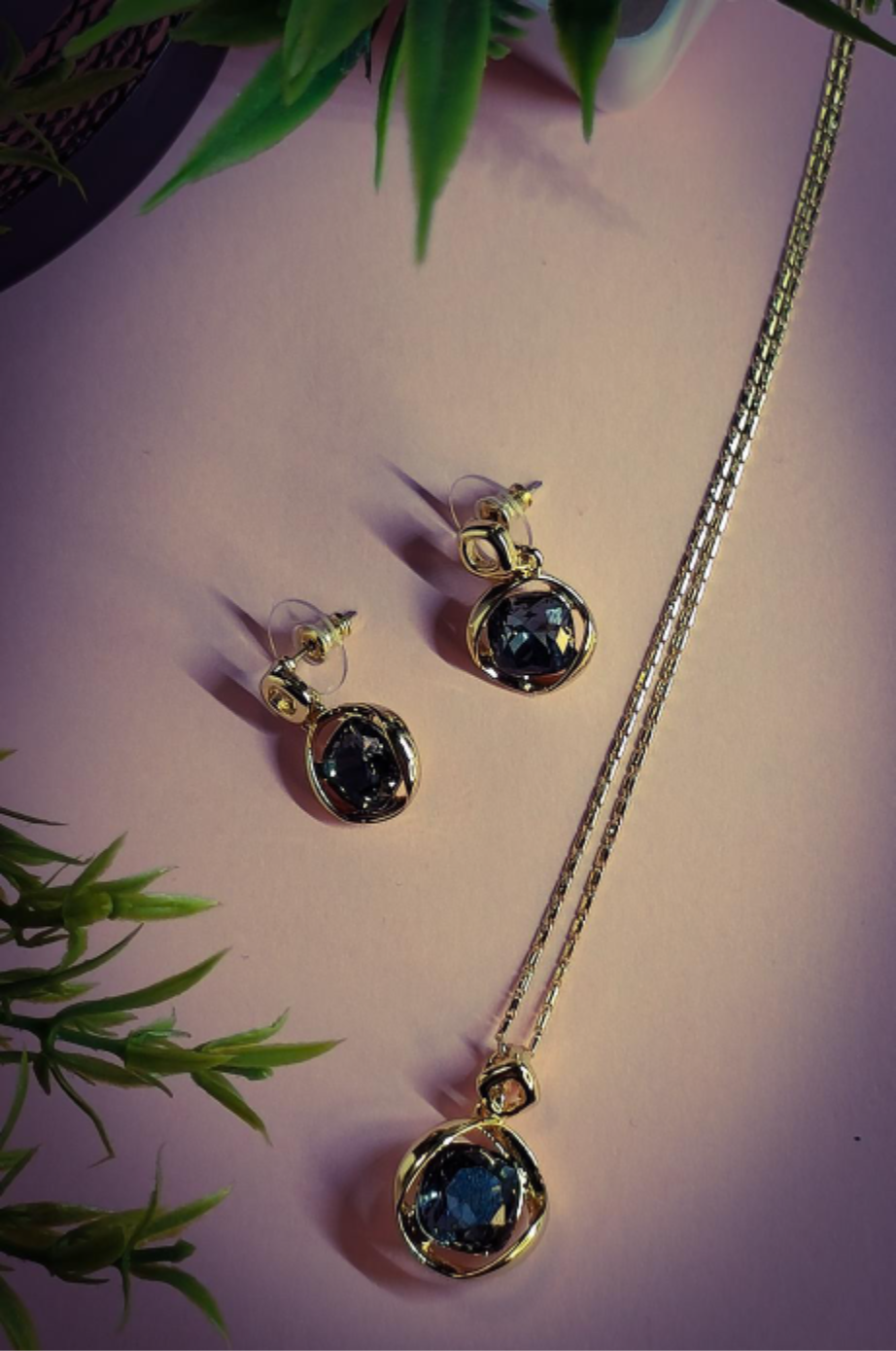 Inspired by the calm of ocean tides, this exquisite set features a unique mix of icy blue, opal white, and aqua-toned stones. Encased in a gold base, the design evokes serene beauty with a refreshing contemporary twist — perfect for a resort look or elegant daywear.