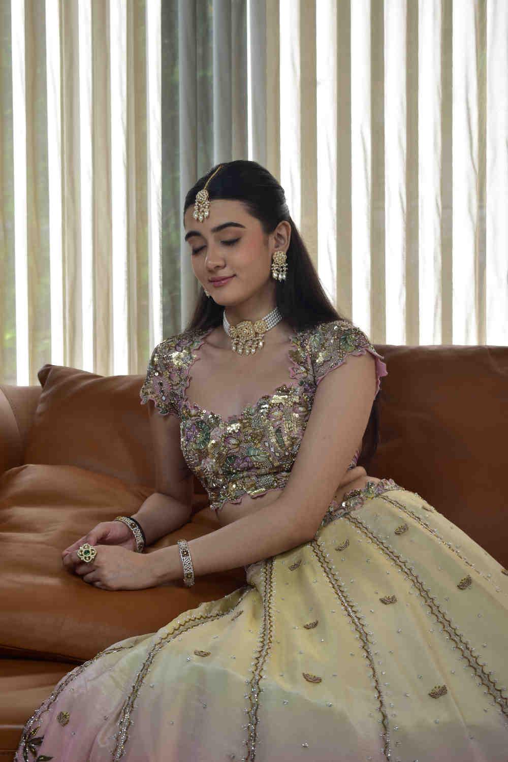 This exquisite Pastel Radiance Bridal Set captures timeless elegance with its delicate blend of gold, pearls, and shimmering stones. The ensemble includes a statement choker necklace adorned with floral motifs, matching chandelier earrings, a maang tikka, intricately crafted bangles, and a bold floral ring. The jewelry complements soft pastel lehengas beautifully, adding an ethereal glow perfect for engagement, sangeet, or bridal portraits.