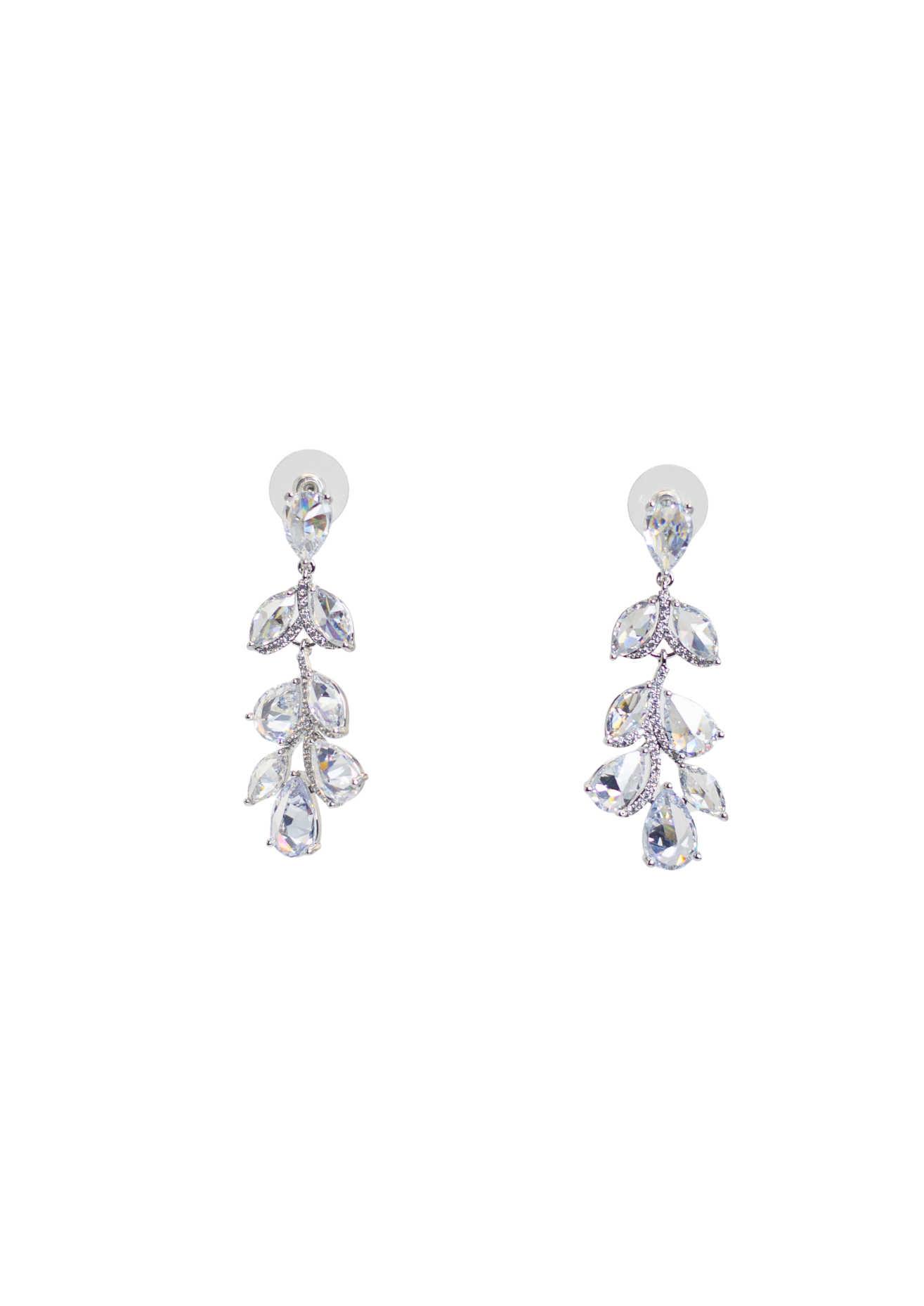 These dazzling drop earrings feature a graceful vine-inspired design adorned with sparkling pear-cut crystals. Set in a sleek silver finish, the delicate arrangement of stones creates a soft, flowing silhouette that exudes sophistication and charm.