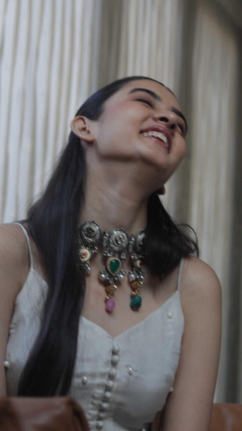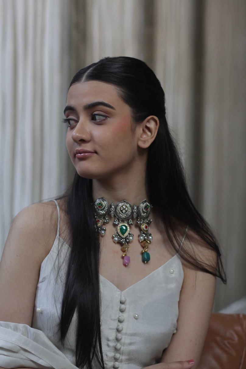 An exquisite necklace adorned with vibrant multicolored gemstones and intricate detailing, paired with matching earrings. This regal jewelry piece adds a statement of luxury and grace, perfect for special occasions and elegant ensembles.