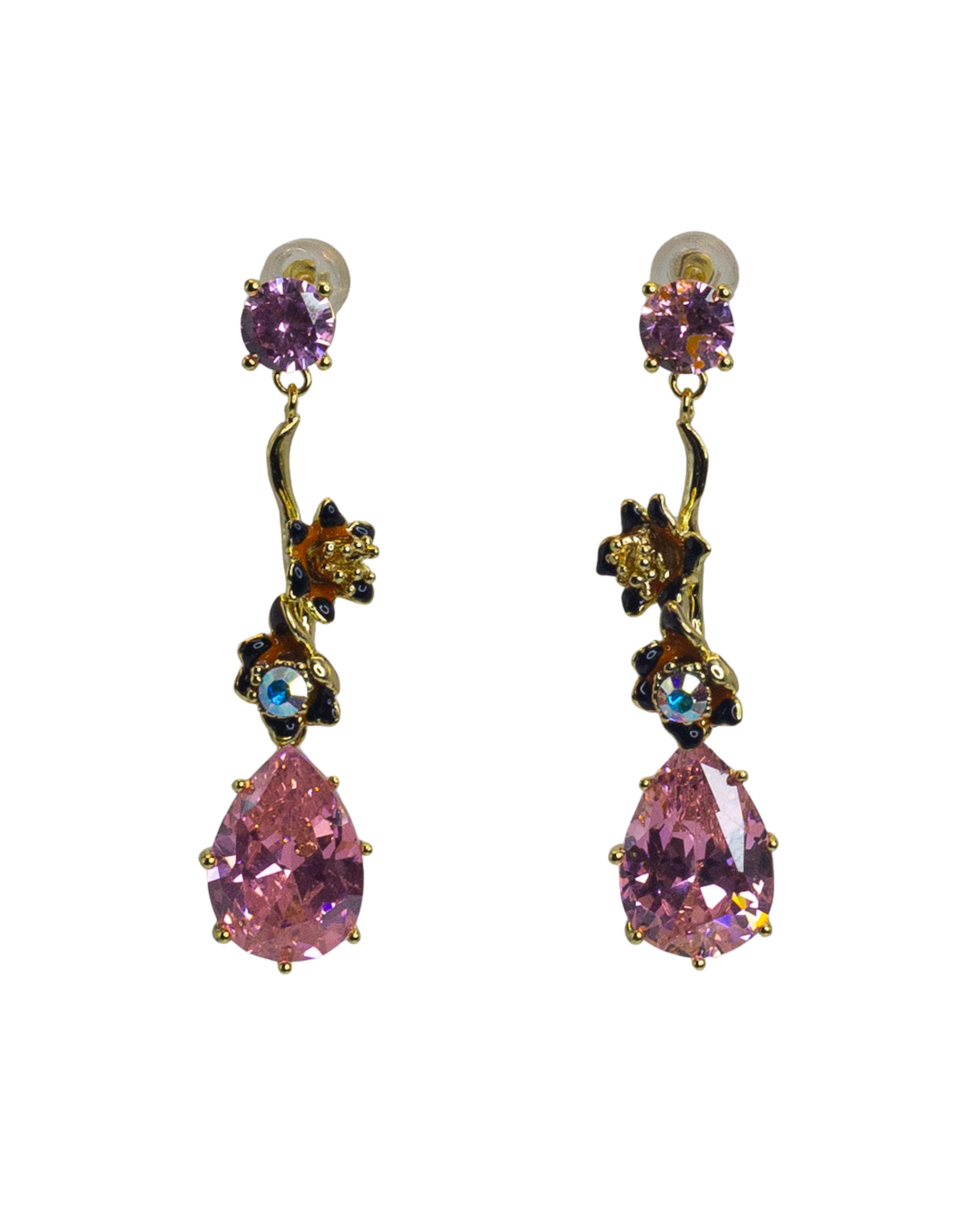 EarringsEmbrace the beauty of nature with these whimsical floral-inspired earrings, adorned with shimmering purple gemstones and a striking pink teardrop crystal. The floral design, with its intricate details and colorful accents, creates a playful yet sophisticated look. The earrings' delicate structure and bright color palette make them perfect for a romantic evening out or as a thoughtful gift for someone special. These earrings offer a beautiful balance of elegance and charm, making them a versatile addition to any jewelry collection.